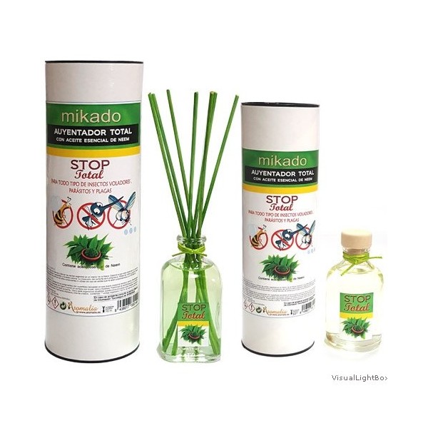 Mikado ambientador repelente de moscas, mosquitos de todos os tipos, vespas e todos os tipos de insetos voadores. Contém óleo essencial de nim. Inclui palitos para colocar na garrafa e ampliar o efeito do óleo de nim. Para interior e exterior.