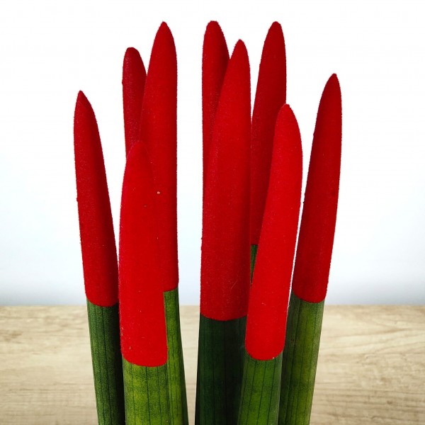 Esta Sansevieria cilíndrica, com os seus longos caules verde-claros, possui pontas aveludadas num tom vermelho profundo. Uma ótima adição decorativa para qualquer casa ou escritório. Vaso de cerâmica branca incluído.