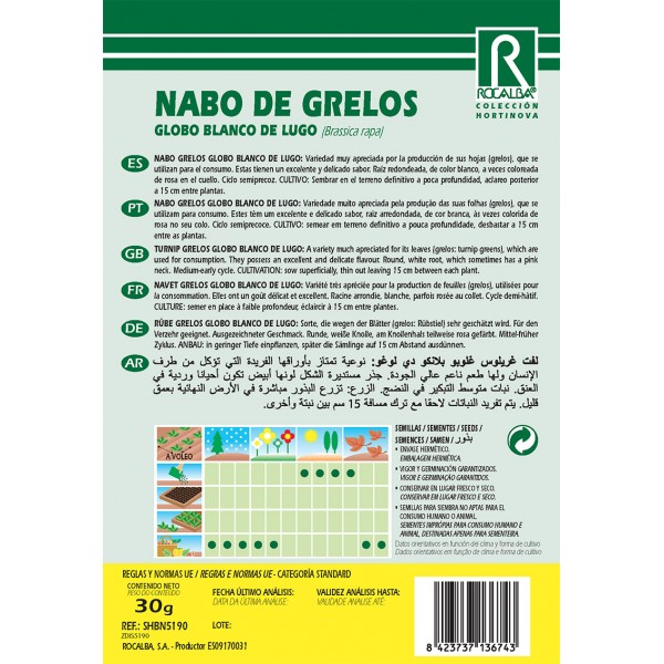 Variedade muito apreciada pela produção das suas folhas (nabo), que são utilizadas para consumo. Têm um sabor excelente e delicado. Raiz arredondada, branca, às vezes rosada no pescoço. Ciclo semi-precoce. Semeie no solo final em profundidade rasa, desbastando após 15 cm entre plantas.